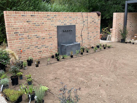 Designed in collaboration with Tania Brookes Garden Design. The house is tucked away within a cul de sac with the garden backing onto a brook and copse. The clients wanted to incorporate dining and entertaining space with a pergola, a wildlife pond and space for a golf practice net and raised vegetable beds.