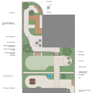 A complete redesign of this split level garden, incorporating pieces from the client’s previous garden. The large stone bowl provided inspiration for the design, with its shape echoed in the circular terrace and the curved planting beds.